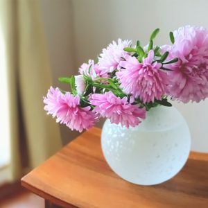 先週買った アスター大輪🩷 「ミスヨーロッパレジスト」 花はきれいなのに 葉先が茶色くなってきて… 短く切って飾る もう少し 楽しめるかな….。*∘˚˳°