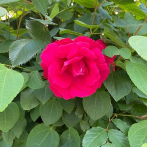 うちの玄関先の、シンボルローズ。 「マイレイコ」とも「ローズオオサカ」とも。 個人的には、作出者の奥様の名前からとった前者推し💖 それにしても、バラハキリバチの葉の切り取り跡が、痛々しい💦