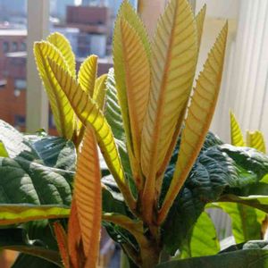 わぁー、陽ざし浴びて枇杷の新芽🌱が大きくなっています。 種から今や1メートル位かなぁ