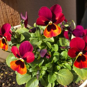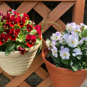 今日はお日様☀️が暖かくて 我が家のももかシリーズビオラちゃん達が 可愛いく咲いてきました😍 小さな吊り鉢に一株づつ植えたんですが 立ち性みたいでこじんまり咲いてます😁