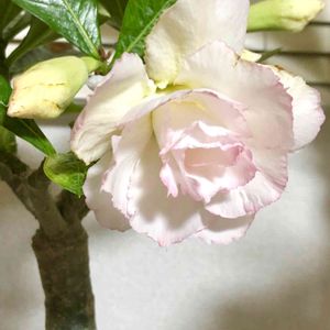 今日のアデニウム ホワイトローズ🤗💕 ピンクのエッジが優しい、好きなお花。 2019年11月22日の投稿にあるように、ベランダで寒気に当てて死にかけた生き残り。 また咲いてくれることに感謝‼️😭