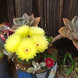 こんばんは☔ 先ほどから雨が降り始めました 天気予報では☁だったので、サボテンの花は開かないかなと諦めていたのですが、陽が差し出す時もあり、見事に👏檸檬イエローの花が開きました💕