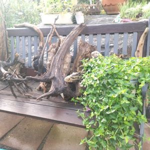息子が拾ってきた流木。満開を見たいスーパートレニアカタリーナ。 二世帯住宅の息子たちのリビングはコウモリラン。また増やすかも。