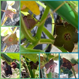 ガガイモ科の蔓性塊根珍種 マテレア・シクロフィラが いくつもお花を咲かせながら 塊根から伸ばした蔓を巻きつけ1.3m 元気だね〜😁 もう1株はまだ小さく 蔓もそんなに伸ばさず 開花もしてないから交配作業は... あちこちでガガイモ科多肉が開花して 銀バエがどこからか??? 香りを嗅ぎつけやってくるのに🪰 ザンネン(๑•́ ₃ •̀๑)笑💦