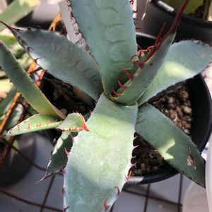 アガベ 屈原の舞扇 絶好調で葉が出てます。持っているアガベで1番棘が赤いのでお気に入り😆 安い良く育つ棘が赤い でもっと人気あっても良さそうなアガベですが…。 ちょい古の棘と新鮮な棘の色合いの差が百足の足っぽいのでダメな人はダメかも💦