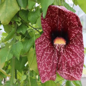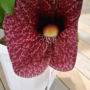 アリストロキア・ギガンティア (ウマノスズクサ科)…原産国 ブラジル東南部🇧🇷 カタカナいっぱい並んで読みにく〜い🤣 霜降り肉みたい🥩 他の植物に巻き付いて成長する蔓性植物。花に独特の香りがあり、虫を誘き寄せるとか。花冠の中央部に袋があり、虫が閉じ込められ受粉が促されるようで。霜降り肉の様に見えるところは、花ではなく萼。 私の手のひらくらいの大きさです🥩