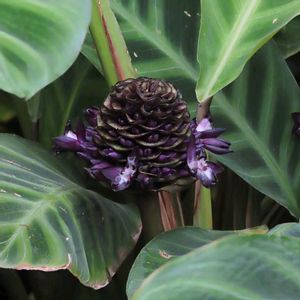 地味なような 派手なような ヨウラクツツアナナスが咲いてました。細長い花をぶら下がるようにつけてます。初めて見ました。 昭和初期に渡来した植物で,暖かいところでは戸外でも冬越しできます。とにかくこの花が面白い。茎はピンク、しかもショッキングピンクでガクもピンク。そこからねじれてグリーンの花びらが出てきて、縁取りが青紫。しべはグリーンで真っ黄色の花粉が付きます。 ブラジル原産の花。 英語名では「女王の涙」と呼ばれる。 和名では仏像が首や衣服に着ける装飾具「瓔珞(ようらく)」の名を冠しており、カラフルな花を稲穂のように下垂させています。