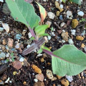 モナルダ💜ベルガモット 切り花の枝をズボラ挿し木🌱 ポチッときって、 花壇に割り箸で穴を開けて 切った枝を差し込んで ギュギュっと土で抑えて… あとは大地にお任せ(^^) ダメ元で植えたら、花芽がついて、 6日後には、花びらが粒のようになってきた❣️自然の力ってすごいなぁ〜٩( ᐛ )و この低いところで、このまま咲くのかなぁ?もっと伸びていいんだよ🤗💕🌱