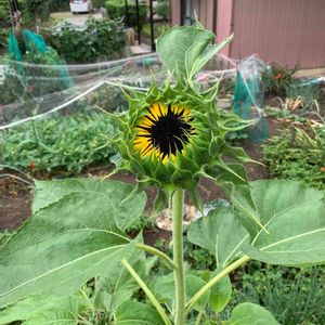 今年の春にタネを蒔いたひまわりさん🌻 私の背を超え、お花が見えない❗️ 雨の中、手を伸ばしてパシャリ 雨が溜まっちゃいそう(^^) 下の方は、脇芽が出てつぼんでる これから夏 楽しみだなぁ〜❣️