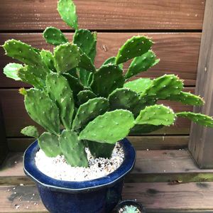 おはようございます☀ ウチワサボテンです。 友人宅からポキポキと何枚かもらったものです。 次々に葉を付けて こんなに大きくなりました。 このところの強い風に何回も倒してしまい、 大きな鉢に植え替えました😃 友人宅では地植えで、高さは1メートルを超えて います。 強い棘と目に見えないちーさな棘があって 大変でした💦