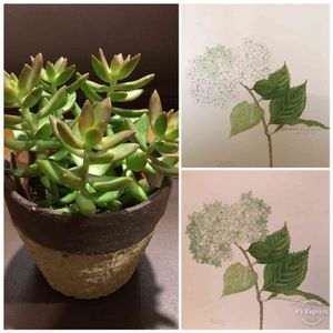 秋色の紫陽花を描き始めました。 このところ 多肉さんや庭の整備にかまけていて ずっと描いてなかったので うまくいかない💦 葉を塗り始めたけど飽きてしまった 花に取り掛かったけどうまくいかない💦 果たして仕上げることができるだろうか? 隣は先日手に入れた銘月💕 良い色になるように陽に当てています。
