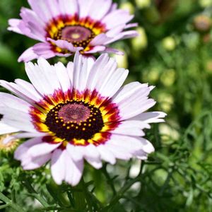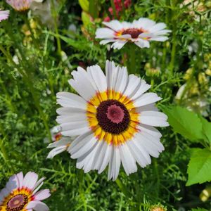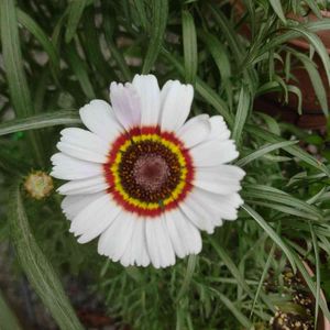 ハナワギク(花輪菊) 🌼✨ 開花 (別名・クリサンセマム・カリナータム、サンシキカミツレ) (英名・ペインテッドデージー) 春蒔きした、 100均のミックスシードの中から咲きました(*´∇`*)🎶 去年は、 生育条件悪すぎな密な環境の中で、 小っちゃ~く、模様もなく不格好な子が1つ咲いただけで、 コラージュして無理矢理投稿したのですが😅、 その時、リベンジを誓いました✴️ 「来年は、綺麗に咲かせてあげるからね~😫💦」 💠綺麗に咲いてくれたとは言え、 花弁が不揃いに見えるのは、 「シュンギク属」の特徴なんですかね~🤔 春に見た「シュンギク💠」の花も、花弁は不揃いでしたし…… 💡和名の由来になってる、 花芯部を縁取る蛇の目模様もクッキリ現れてます👀✨ 英名の「ペインテッドデージー💠」の「ペイント🖌️」からも、 特徴を感じます😌 他の色も咲いてくれると嬉しいな~(*´ω`*)💕