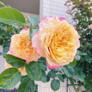 🌹コルデス ジュビリー🌹 やっと咲き始めました🎵 咲き始めは黄色💛咲き進むと、丸い花弁に周りから赤が入ってきます。 クライミングローズなのに、冬場に1mくらいに強剪定して、木立性のように育てています。 直立してよく伸び、直径15cmの大輪の花が25こくらいついています。見応えがあります。