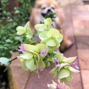 オレガノ ケントビューティ 「お母さん 外へ行きましょう。家は飽きました。」 ここちゃんの顔圧に押され、曇ってきた午後 庭へ! 購入後、地植えがお気に召さないオレガノは、イチマーイ 二マーイと葉が茶色くなっていきました。どうしてもビューティの花が見たくって鉢に転校。転入先の美人アークトチスの横が気に入ったらしく、可愛く育ってくれています🌿 どんなになったら 切り戻し? お時間ある時に 教えて下さい🤗