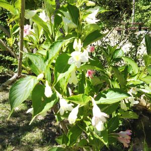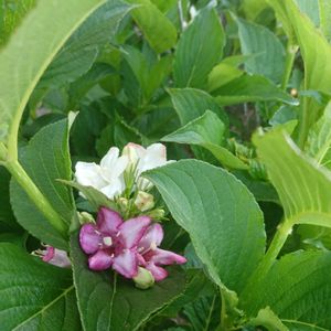 [回答] スイカズラ科の 「箱根空木(ハコネウツギ)」と教えていただきました。 ウツギもいろいろ種類があり覚えるの大変ですね😅 【名前を教えてください】 大きな葉っぱに 白色や薄ピンク色の花を咲かせています。 名前を教えてください🙇