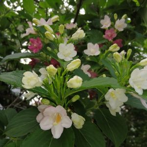 ハコネウツギ・・・ 花が白→ピンク→赤と色変わり🌸 🤍🩷❤️ キタテハ🦋が吸蜜中😋 色違いの花が混ざって咲いていて可愛い😍