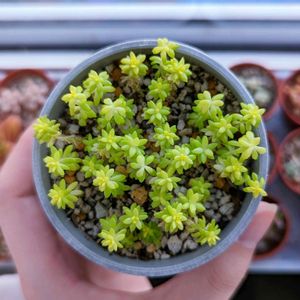 よく似たセダムさん2種 比較してみました🌼🌼 ⬆️ゴールデンカーペット 黄金細葉万年草 小ちゃい葉が隙間なく集まっ ています🌼 ⬇️ミモザ 一個の葉が上と比べると 大きいです🌼🌼