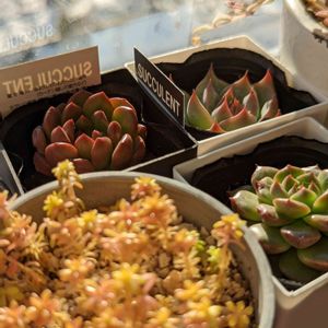 寒空の下うちの多肉さんたちが光合成中です。 曇っているので、効率はよくないと思います🌥️。 12/29にお迎えしたオウレイちゃんとピンクルビーちゃんは数日間お部屋でうちに慣れてもらった後に、紅葉させたいからベランダに出しました。 12/29のpicと比べてオウレイちゃんは黄色っぽく、ピンクルビーちゃんもピンクがかかってきました。 だだ、虹の玉ちゃんは1ヶ月以上ベランダに出しているのに真っ赤にはなりません。 気温高過ぎなのかな🤔。 ゴールデンカーペットちゃんは紅葉しないからそのままでもいいけど、もふもふ(ノ)•ω•(ヾ)に繁って欲しいです。 一番右のセダムは種類がわかりません。(お迎えしたときはセダムとしか書かれてなかった) もしお分かりになりましたら、教えて下さい🙇。 ➡️リトルミッシーではとのご回答がありました。ありがとう😆💕✨ございました。