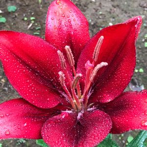 おはようございます😃☔️ 咲いた咲いた赤いユリが咲いた🎶 鮮やかな赤いユリが咲きまさした💕 我が家の庭の6個目のユリ✌️ 読売新聞購読者サービスに感謝❣️