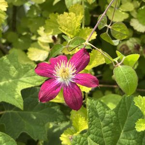 見たことのない?クレマチスが咲きました…😳アナタハダレ⁈ このあたりには、クレマチスの麻生、コンテスドブショー、ダッチェスオブアルバニーが植えてあるのですが、周りの植物も含め剪定などのお世話をサボっているためジャングル化しつつあります😅 春に麻生が咲きましたが(2枚目)それ以降、今年はコンテスドブショーの花は見られず、ダッチェスオブアルバニーは野バラと同じ場所で茂っていたところを夫が野バラを丸坊主に剪定してしまったので、一緒に切られてしまって…😵 そんな中、咲いたのがこの花です😅 花の径は7〜8cmくらいで麻生より小さめ、花弁の感じはコンテスドブショーっぽく、花の色はダッチェスオブアルバニー…⁉️そもそもダッチェスオブアルバニーは形が全然違うのですが…色は舞姫にも似ているような🤔でも舞姫はここには植えておらず今は枯れてしまっています…💦 かわいいのですが一輪しか咲いていません… 本当に、あなたは誰?🤣