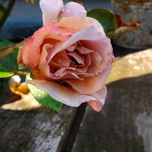 咲いているバラ切って 窓辺の外側に飾りました 家の中ではすぐにへたっちゃうので