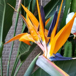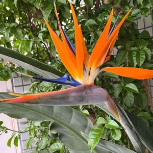 ✿ストレリチア✿ 《極楽鳥花》 *極楽鳥花の佇まいがニューギニアに生息している極楽鳥の飛びたつ様子やトサカに似ていることに由来 花言葉 『輝かしい未来』 『気取った恋』 オレンジ色の部分は花を包むガクで細長く、青い部分が花弁になる。 街中の通り沿いに鉢植え (5月末)