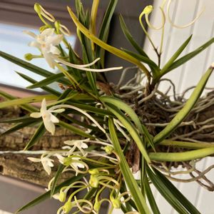 風蘭、満開です(≧∀≦) 丸い花が好きなのですが、白い細い花も可憐な雰囲気です😍 蘭を外に出している夏に、開花するので買い渋っていたのですが、 開花のときだけ部屋に入れているので問題あるなかったです‼️ 石鹸🧼のような、とてもいい香りです💕