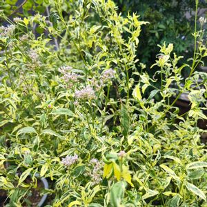 ユーパトリウム:ピンクフロスト キク科アゲラティナ属の多年草 ・西洋種のフジバカマ ・幅広の黄斑が葉に入り 花が無い時期も班入り葉がカラーリーフとして楽しめます
