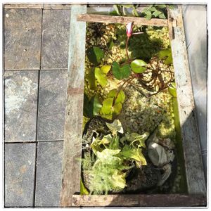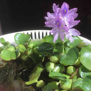 子メダカの池(・シンクの桶ですが)のホテイアオイに花が咲きました。 何年も置いてますが花を見たのは初めて
