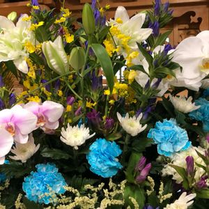 義祖父99歳の、お花に拘った菊が少なめの祭壇 義父が育種研究者ということもあり、生前の義祖父の希望も取り入れて、いろんな花で飾られていました。 造花はありません。 ブルーのカーネーション。今回は白の花に水彩絵の具を吸水させたそうです。 食紅もとっても良いそうですが、色はこちらの方が安定しそうです🩵