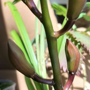 蘭が元気です。胡蝶蘭の花芽、こないだ支柱をしてから15cmほど伸びました。きれいに伸びてくれています。葉っぱはズタボロだけど。ごめん、ほんと。 シンビジュームまだ咲かないけど蕾がだいぶ膨らんできたかな。蜜すんごい出まくりです。