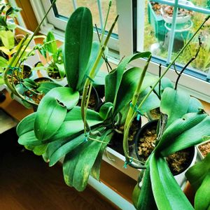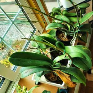 昨日ミディ胡蝶蘭2人目が咲きそうだったので見に行ったら咲いてました。ダイニングに移動させるため育成場所(今は亡き父の部屋の南向きの出窓にまとめて置いてる)から抜いてみたらまさかの3本立てでびっくり。他の人たちも確認してみたらミディさん4本立て、大輪の3人も3本に枝分かれ…えっ、何があったん?肥料効果???まぁ、全部咲くといいな。