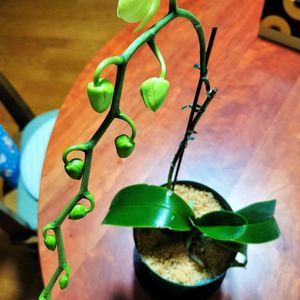 ミディ胡蝶蘭さん、1番早い子が開花を始めました。夏の管理が適当すぎて結構ズタボロなんですが、家の中に入れてから木質ペレット植えにしたのが合っていたのか、加湿器のおかげか、キレイな葉っぱも新しい根っこも出て、蕾も11個もつけてくれてます。蕾を落とさないよう、水やり多めで見守らせてもらいます。