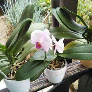ららん藤岡道の駅の蘭店で、一株300円で売っていたので、3個買って来ました😊 真ん中がミディ、両脇が大輪の胡蝶蘭の白です🤗 明日、植え替えをします💦 花の咲くのをお楽しみしていて下さいネ〜