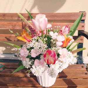 奥様のご実家からお供え用のお花を所望されて、久々に庭のお花から作る自己流フラワーアレンジメントに挑戦。 …とは言え、辛うじて残ってたチューリップだけでは足りず…今回は初購入した花材、桜小町とやらを合わせてみました。う〜ん、何とか春っぽい雰囲気になったかな…?(^_^;)