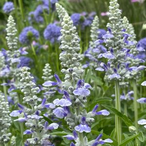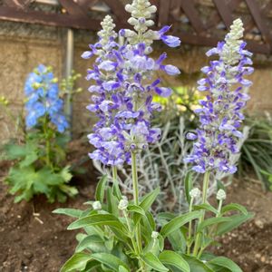 サルビア サリーファンの 美しいスカイブルーの花が咲き始めました 。:.゚ஐ⋆* 昨年秋から、同じ場所に鉢を置いたままで 冬越しをしたお花 爽やかでありながら 逞しく♬ 白色のアンゲロニア セレニータとの寄せ植えで この夏を楽しみます ♡(。☌ᴗ☌。)