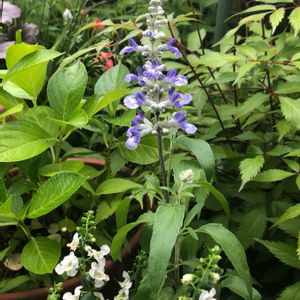 サルビア🌈(サリーファン) 関東圏でも大きな地震、怖いですね 大丈夫でしょうか しばらく余震に気を付けられて下さい。 サルビアでは自分で初めて購入した子、3年目になります。 去年、植え替えをしたので、花博の寄せ植え体験で頂いたサリーファンも一緒に植えました。 爽やかな色合い、花期が長いです💜 先日の風雨で折れてしまったので玄関に♡