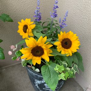 昨日向日葵を購入したので久しぶりに寄植えを作ってみました。 いつも日没前から作業しますので、終盤株元がよく見えなくて焦りました😅