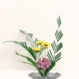 こんにちは😃 今回の生け花💐 アレカヤシさんを見ると、私は葉っぱを漉いてあげずにはいられないタチなので、今回も遠慮なく🌿✂️しました😊 ジグザグに🌿✂️されている方もいらっしゃって、その技術に見惚れてしまいました😃✨ 暑い日が続いているので少しでも涼しさを感じていただければいいな🎐