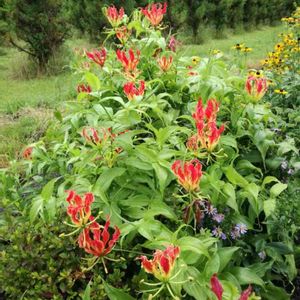 咲いています。名前忘れてしまいました。宜しくお願いします。 *グロリオサ* 別名 キツネユリ まろんさんが教えてくださいました。