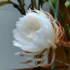 リアルタイム投稿です。 月下美人が咲きました。 例年なら7時頃から咲くのに、今年は遅くて今の時間。 香りも何時もより控えめです😌