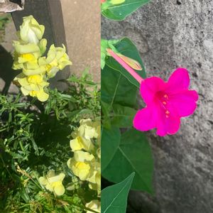 おはようございます。根性の花、①排水口の近くサッシ/コンクリートの隙間から生えたキンギョソウ、薄黄色の花を咲かせました。お隣りの空き地、階段のコンクリートの隙間から生えた白粉花赤い花を咲かせました。頑張ったね〜ありがとう🥰😍😻😸😊🤗