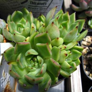 🏷ニョロン(26日)の日 赤フチさんのニョロンで参加しまぁす♥ 昨晩から☔ 風も強くてやっぱり結構ぬれてそぅ💦 雨が上がったから、ニョロンを探しに汚庭へ💦 水はけ悪く足元水浸し😿 シュシュするくらいで今日は休業かな? また降ってきました;(´•௰•`)☂💦 👈👆から ฅエンディミオン(リエール産) ちょっと前までオレンジ系の色に赤フチと棘❤️ 可哀想にすっごくみどりんで綺麗な時に虫にやられて傷傷になったのにも負けず三本立ち❤️ ฅシャイニングパール✨ お肌つるつるぴかぴかな方😻 ฅ名無しの98円多肉ちゃん🍀 ฅメキシコポルデンシス×オビフェルム(リエール産) 全体的に赤みに赤フチが一際目立つ😻 ฅコロラータ(多分)×スリョン(45さん) 赤フチと棘が綺麗~~~😻 すみません💦 タグが破れました😿 ฅマスカポーネ(吉坂産) もう1字欲しい🧀 その名で出てる事もあるよね😺 紅葉の綺麗な今、赤フチ同盟タグつけさせてくださいマセ┏○ペコッ ✍️エンディミオンのみプレステラ90、他は105 花芽はニョロン弱めかなぁ💦 今度は咲いたお花を猫さんたちに持たせたいな🌺