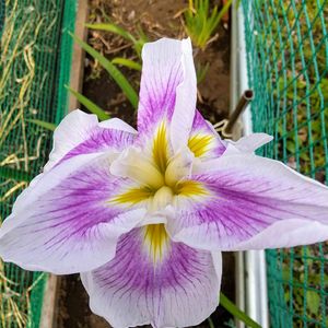 畑で ハナショウブが咲いています😉 猛獣避けネットと隣との境のネットに挟まれて窮屈そうに咲いています😅🤭