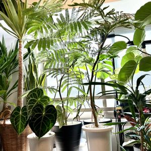 癒しの空間😊エバーフレッシュ😊朝から爽やかな癒しを与えくれます😊今日もありがとう😊エバーさん エバーフレッシュは、ボリビア原産のマメ科コヨバ属の常緑高木です。日本では観葉植物として人気ですが、現地では30mを超すほどの高木になります。涼し気な明るいグリーンの葉と華奢な樹形が人気です。 エバーフレッシュは同じマメ科のネムノキと同じく、夜になると葉を閉じて眠ります。これを就眠(睡眠)運動と言います。この就眠運動は、夜間に葉から水分が蒸発していくのを防ぐ為だと言われています。 エバーフレッシュは、春から夏に薄黄緑色の小さな花を咲かせます。花もネムノキの花を小さくしたような、直径2~3㎝程度の花です。花後には赤いサヤの中に黒い種子の入った実を付けます。これがアカサヤネムノキという和名の由来です。