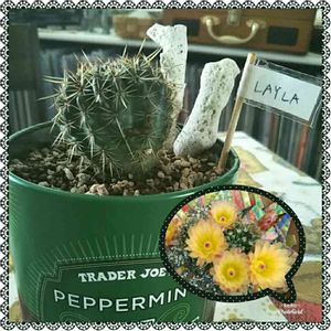 ノトカクタス獅子王丸さん 昨日の続きでごめんなさい。 昨夜は気付かなかったの。 この獅子王丸さんにもピックが挿さってたことを。 しかも勝手に名前が付けられてた! レイラ この子の親が『エリック』だからか‼️🤣 (エリック・クラプトンに〔いとしのレイラ〕という曲があるのです。 ちなみにエリックの鉢はボブ[ボブ・マーリー])😂