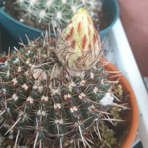 花咲く前のノトカクタス獅子王丸です。蕾が出る場所は刺を出さないなんて考えてますよね〜 ちなみに左後ろは小町で右後ろは菫丸です😂