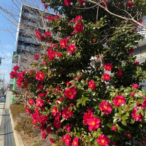 老人ホームの前、陽を浴びてサザンカさんがたくさん咲いていました🌺🌱✨