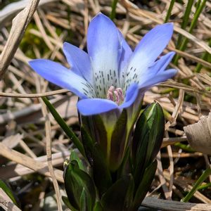 この日は所々に雪が残っていました♪ タテヤマリンドウ(立山竜胆) リンドウ科 リンドウ属 越年草 ハルリンドウの高山型変種 北海道、本州の中部以北の日本海側に分布。 高山や亜高山の湿原や湿り気のある場所に生育。 高さは10cmくらい。葉は対生で披針形、茎に寄り添う。 花は茎の上部に1個。漏斗状の淡青紫色の花を上向きにつける。日があたっている時だけ開く。 花期6〜8月 6月8日撮影 尾瀬