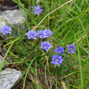 立山竜胆 リンドウ科 リンドウ属 花期:5-8月 山地帯~高山帯の湿地に生える無毛の越年草で、分枝して高さ5-15cmになる。ハルリンドウの高山型変種で全体に小さい。